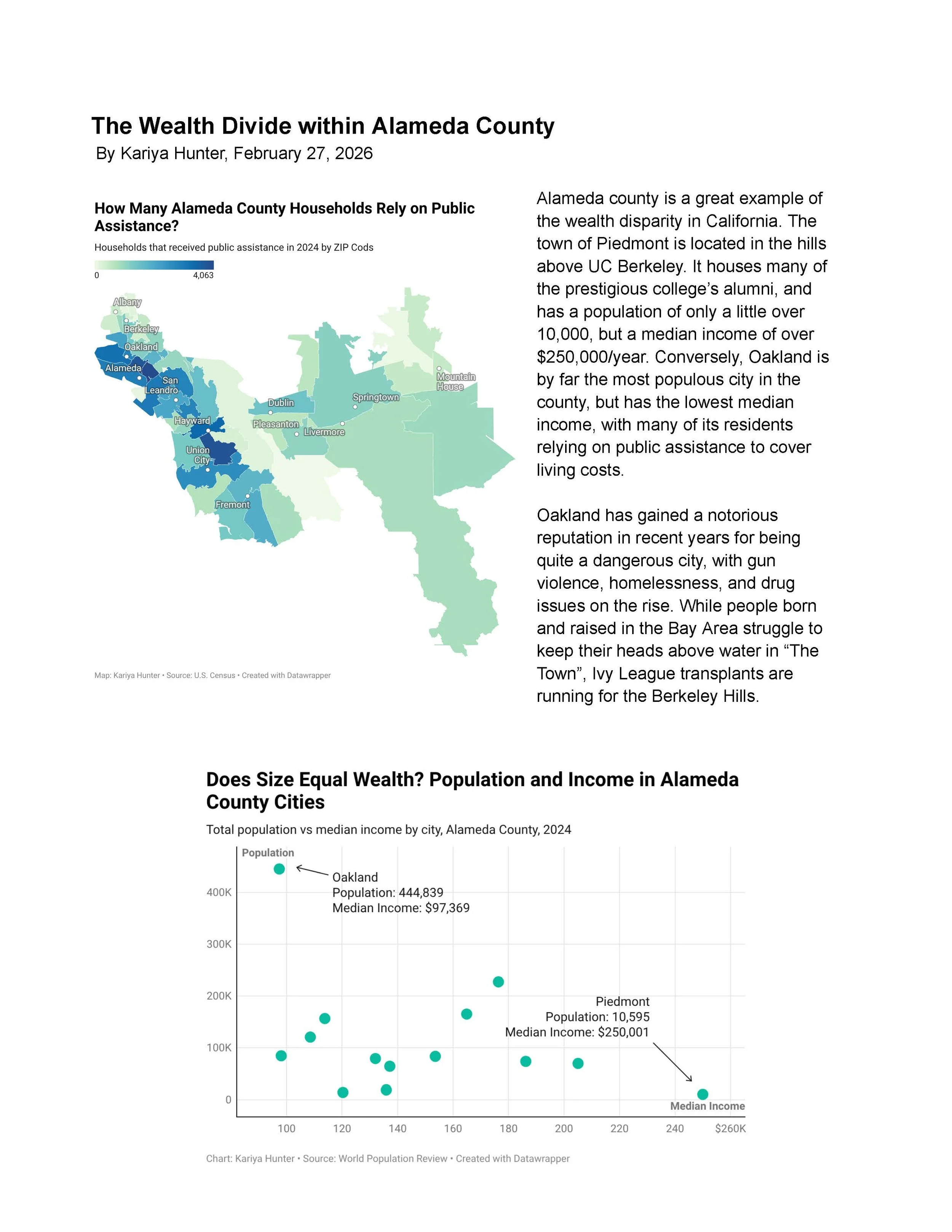 In this project, I used U.S. Census data to visualize the wealth gap in Alameda County through a map and chart created in Datawrapper. The analysis highlights how one of California’s most diverse regions also experiences significant economic disparities between communities.